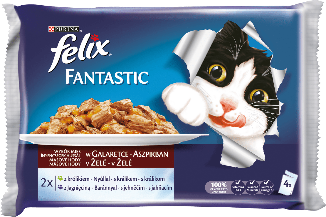 FELIX Fantastic je rada lahodných krmív, ktoré vyzerajú a voňajú tak mäsovo, že pôsobia ako jedlo uvarené Vami samotnými. Špeciálne pripravené z jemných mäsových kúskov v šťavnatom rôsole. FELIX Fantastic v širokej škále rybacích a mäsových príchutí. Tieto lahodné krmivá sú zdrojom esenciálnych omega-6 mastných kyselín a majú správnu kombináciu vyvážených minerálnych látok a vitamínov. Sú plné zdravých dobrôt, aby uspokojili 100% denných potrieb Vašej mačky.