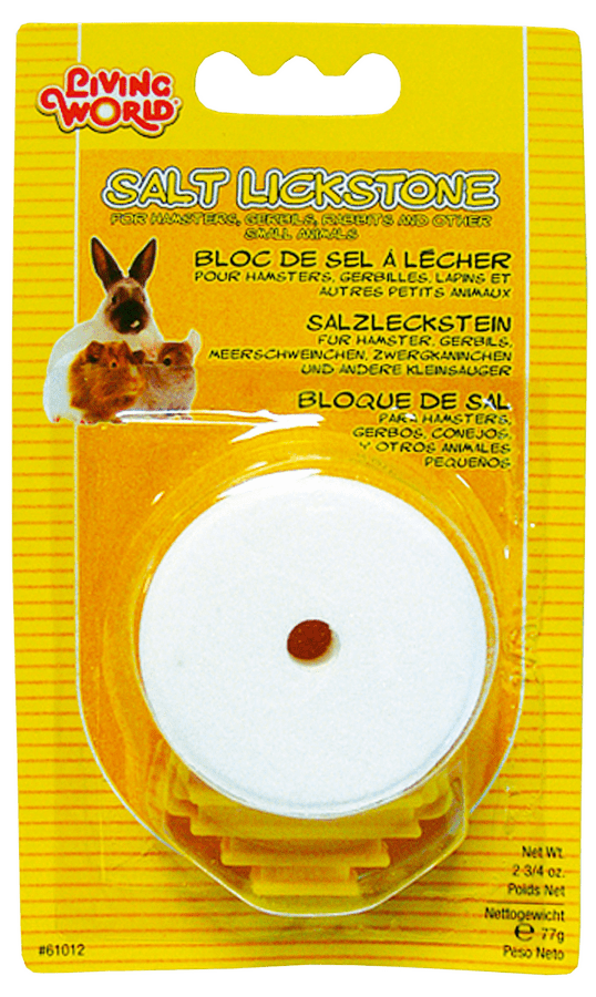 Okrúhly minerálny blok s plastovým držiakom - doplnkové krmivo pre hlodavce.